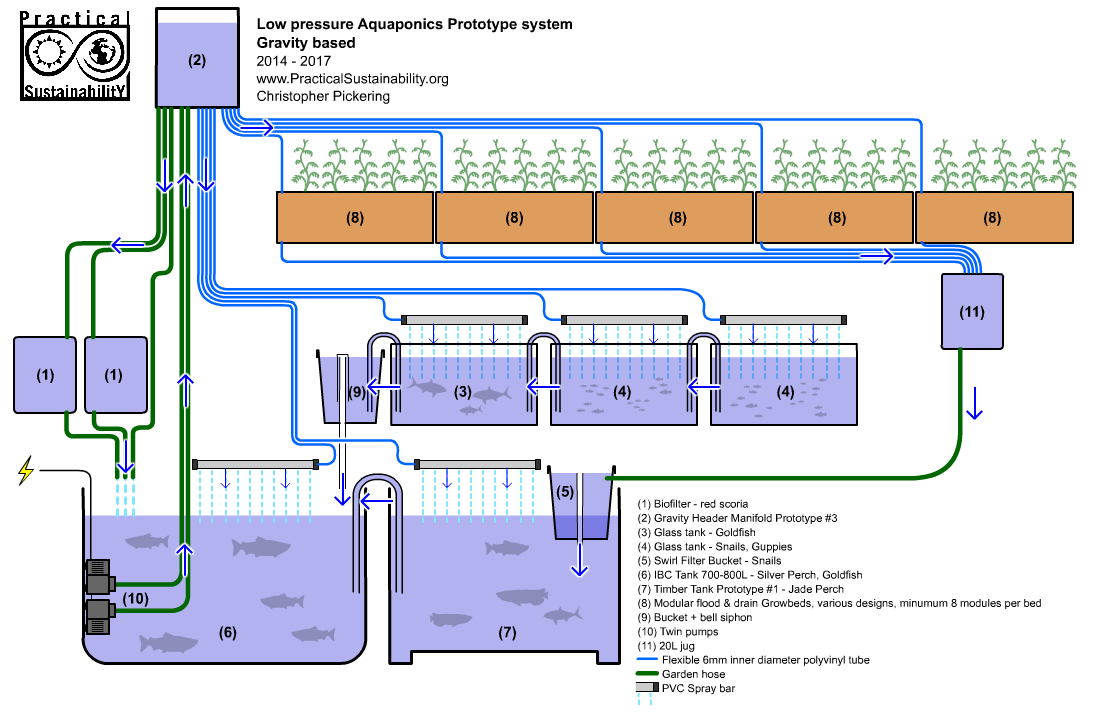 This is the full overview of the Gravity-driven Aquaponic unit prototyping system that ran from 2014-2017 in Sydney, Australia. The system was designed to have zero high pressure plumbing joints or complex fittings, and only use very low flow rate feeds to multiple grow bed prototypes for testing. Every part of the system was modular, down to the individual plants.