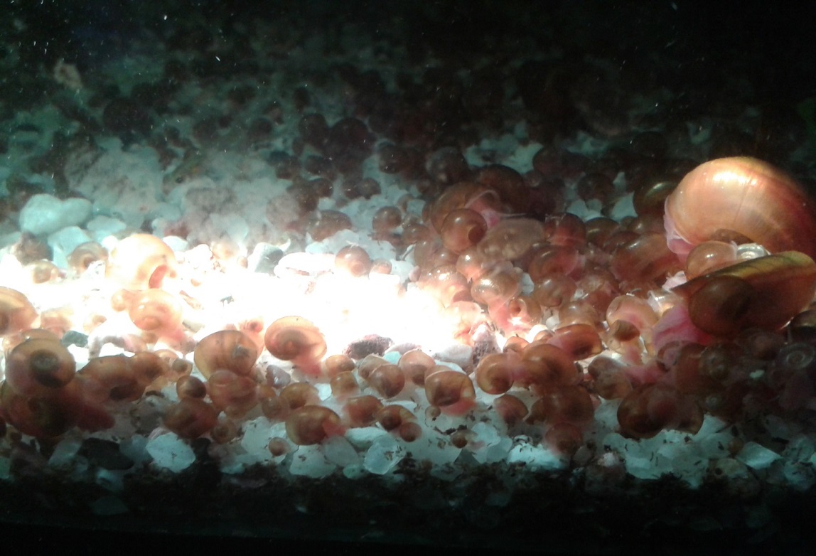 Aquariums (4), (4) Contained guppies and generic aquarium snails. Snail populations followed a boom and bust pattern – during a boom, snails were fed by the handful to the Silver & Jade Perch in the main tanks.
